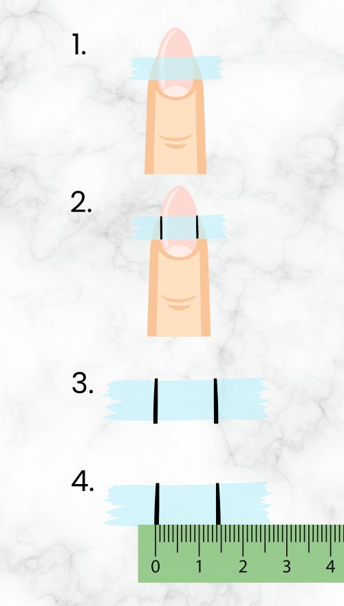 4. Using millimeters, measure the width between both marked lines on the tape using a ruler or measuring tape. Repeat this process for all fingers.